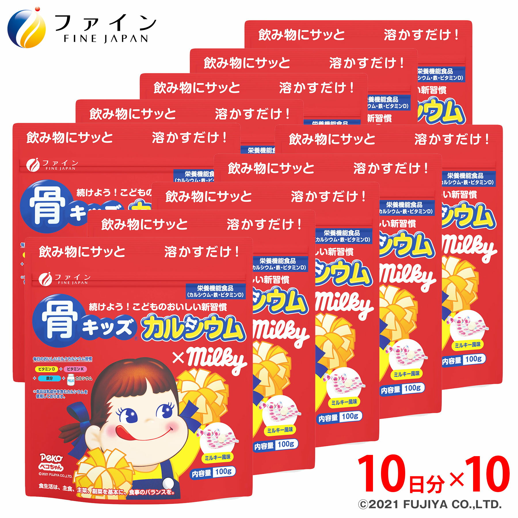 【最大10%クーポン! ~11日2時】 カルシウム 子供 サプリ ファイン 骨キッズカルシウム ミルキー風味 10杯分(1回10g/100g入) 10個セット ビタミンD 5.0μg ビタミンK 鉄 配合 成長 栄養バランス の補給 キ