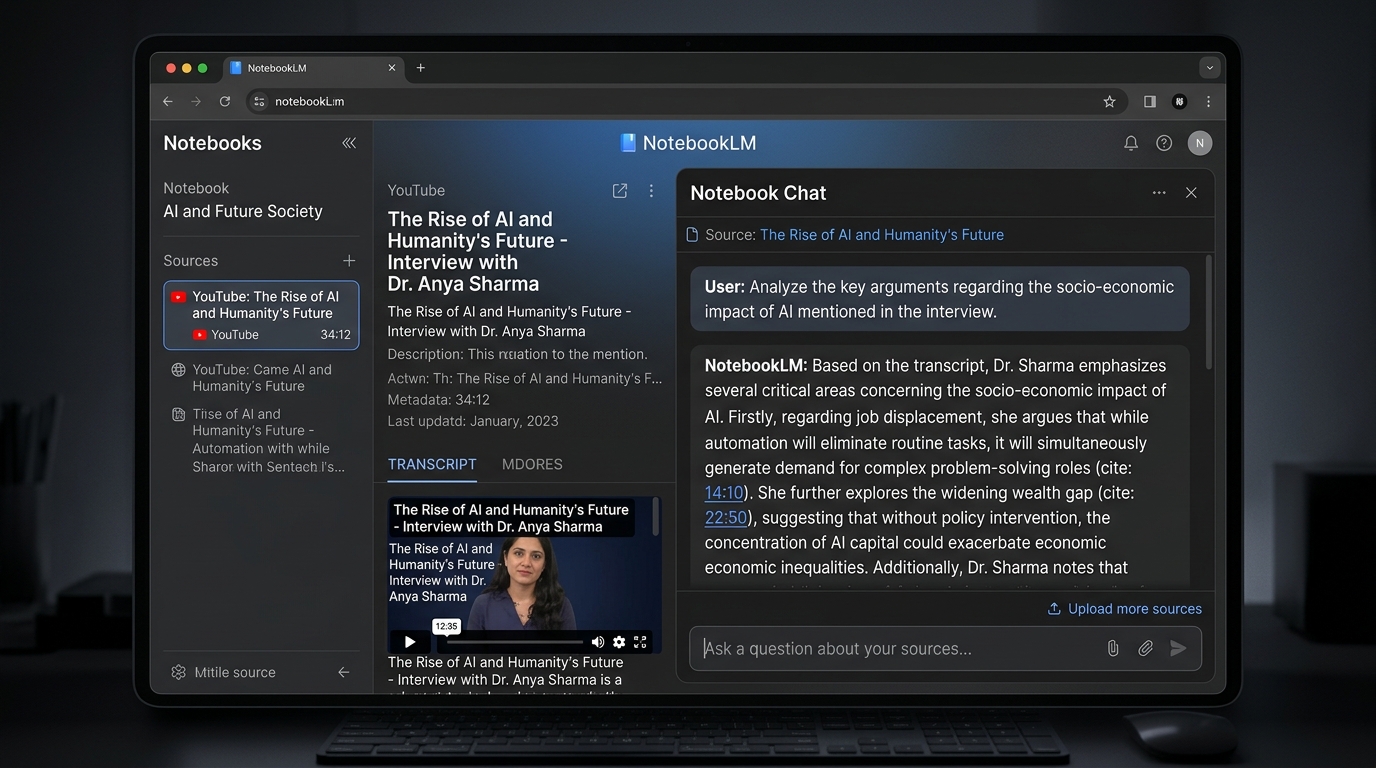 ここで重要なのが、情報を能動的に変換するプロセスです。NotebookLMは、動画のURLを読み込ませるだけで、その内容を瞬時にテキスト化し、要約や構成案を作成します。これにより、受動的な視聴から、AIを対話相手とした「アクティブ・ラーニング」へと学習スタイルを転換できるのです。